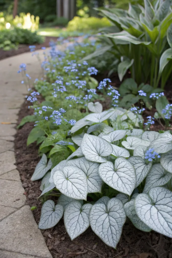 Brunnera offers heart-shaped silver leaves and delicate blue flowers, giving your shade garden a cool, sophisticated look.