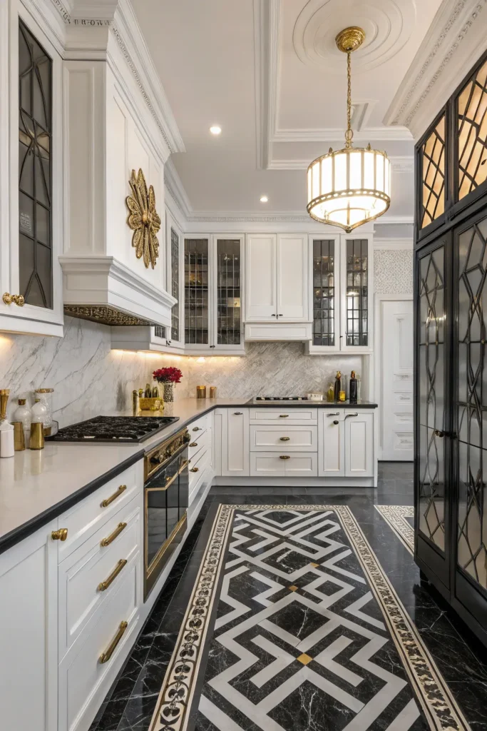 Channel 1920s glamour with sophisticated black and white patterns and luxurious finishes.