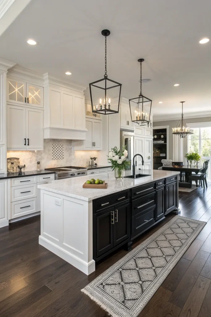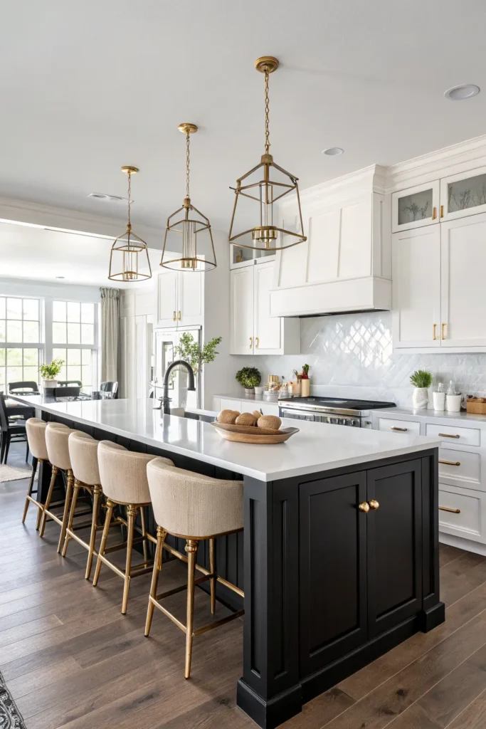 Create a stunning focal point with a black kitchen island contrasting against white perimeter cabinets.