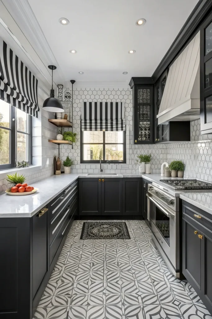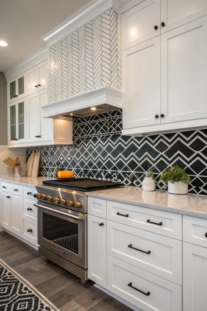 Use bold black and white tile patterns to create a stunning backsplash that serves as kitchen artwork.