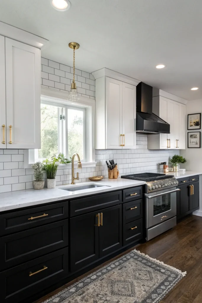 Make a bold statement by using pure black lower cabinets paired with crisp white upper cabinets.