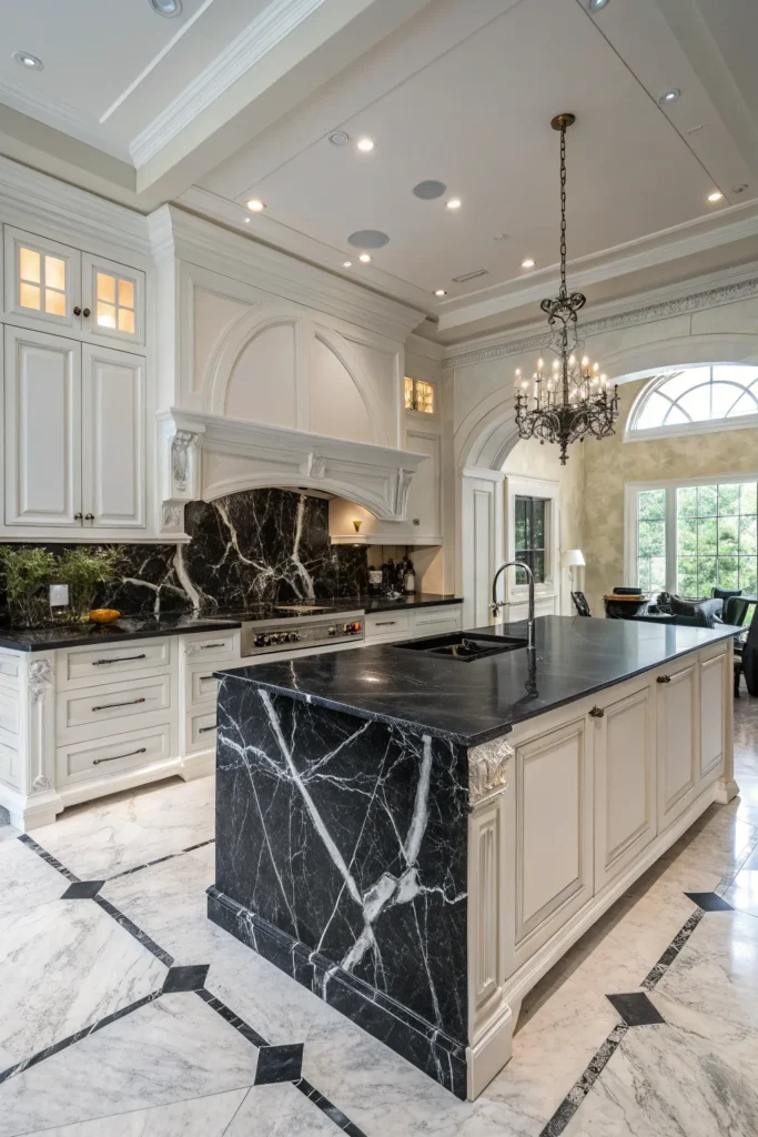 Feature stunning black and white marble as the star element in an elegant, luxurious kitchen.