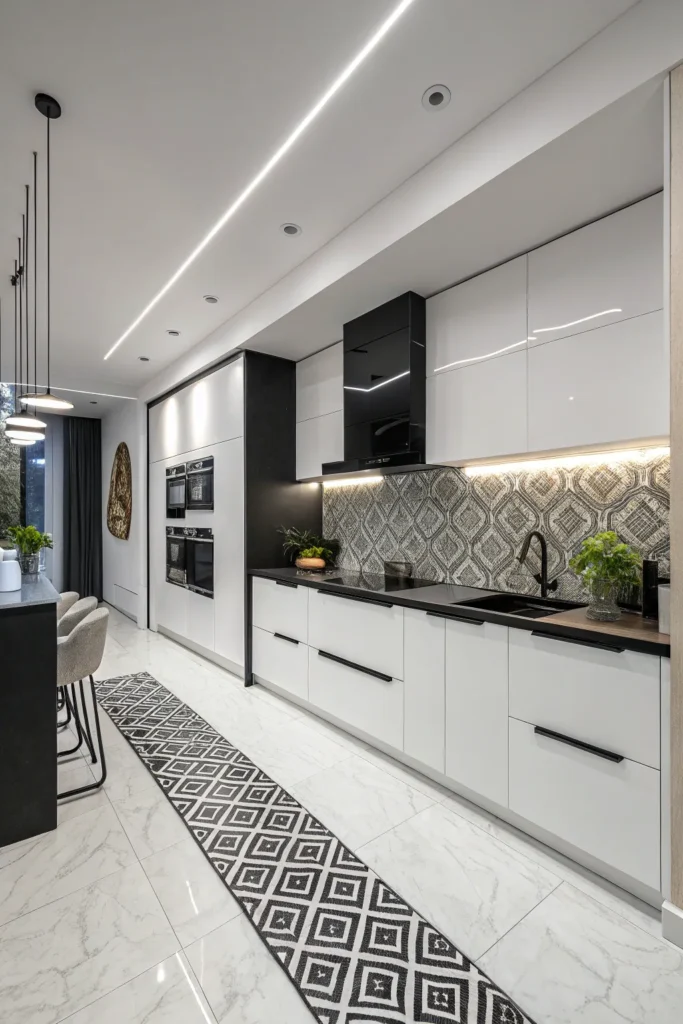 Lighting deserves special attention in monochrome kitchens. Proper illumination prevents black elements from appearing too heavy while ensuring white surfaces don’t become sterile or cold. Layer different types of lighting including ambient, task, and accent lighting to create a well-balanced environment that enhances both functionality and atmosphere.