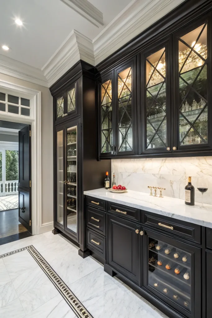 Create an elegant black and white butler’s pantry or prep kitchen with refined details.