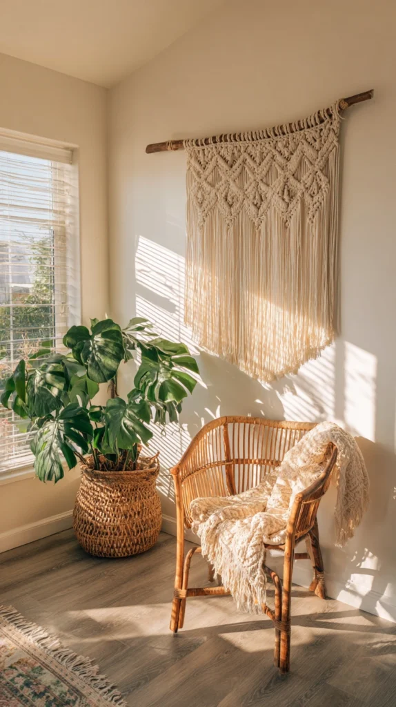 Style tip: Hang the macramé on a wall that receives natural light from one side rather than directly opposite a window. Side lighting creates shadows within the knotted texture that bring the piece to life — direct front lighting flattens it and reduces the three-dimensional quality that makes macramé visually interesting from across the room.