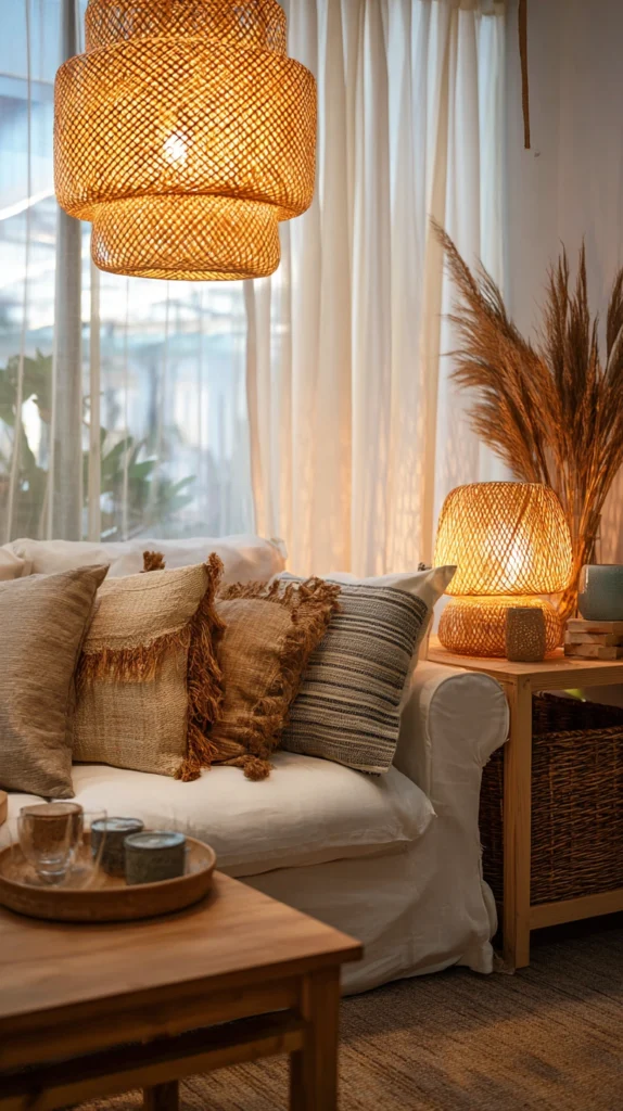 10. Warm Ambient Lighting With Rattan Shades