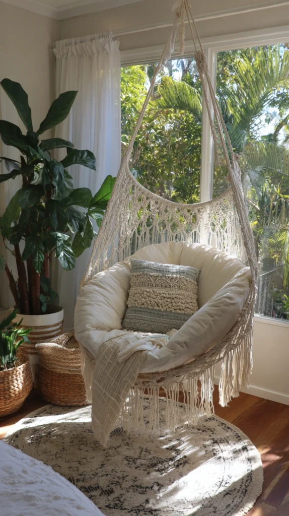 Style tip: Dress the hanging chair with a single oversized linen or cotton cushion and a lightweight throw rather than multiple small pillows. The large single cushion and throw creates the relaxed, inviting quality that makes a hanging chair look lived in immediately. Multiple small cushions arranged formally make it look like a display rather than somewhere to actually spend time.