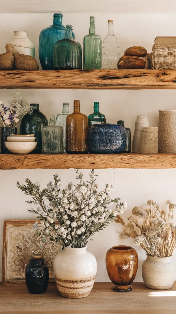 Open shelving styled with a mix of vintage finds, travel objects, books, plants, and candles is one of the most distinctly boho decorating approaches and one of the most personal. The collection is never finished, never symmetrical, and never perfectly curated — which is exactly what makes it interesting. A shell from a beach, a small woven basket from a market, a vintage glass bottle, a hand-thrown mug used as a vase — each object carries a story and the shelf as a whole tells a version of the person who assembled it in a way that matching sets of decorative objects from a chain store never can.