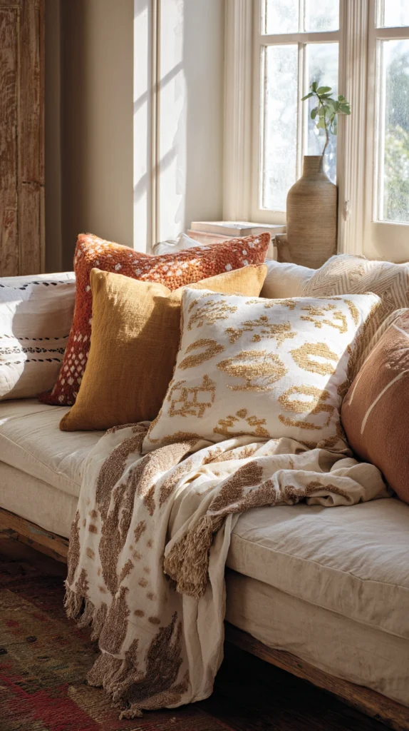 Large floor cushions in linen, cotton, or woven fabric cost $20–$60 each. A Moroccan leather pouf costs $40–$100 and doubles as extra seating, a footrest, or a low side table with a wooden tray balanced on top. A low rattan tray for a surface costs $15–$35. Choose cushion covers in a mix of solid, striped, and embroidered fabrics in warm earthy tones — terracotta, ochre, rust, dusty pink, and warm cream — for a palette that reads as boho without the visual confusion of too many conflicting colours. All fabric selections should be washable given the frequency with which floor cushions are used.