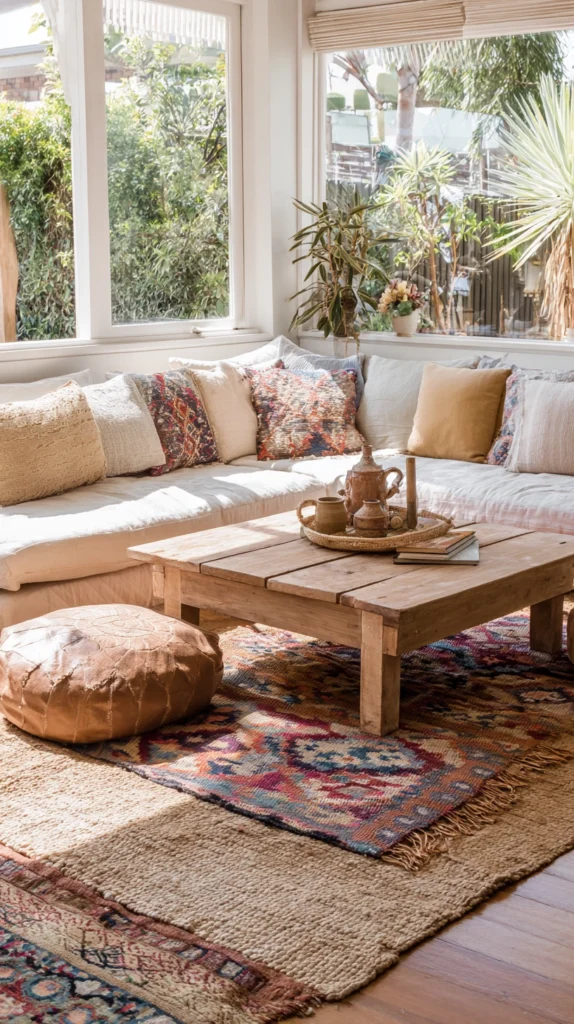 Layering rugs — placing a smaller, more decorative rug on top of a larger, neutral base rug — is one of the most characteristically boho decorating moves and one of the most effective ways to add warmth and visual interest to a summer room without changing the furniture or wall colour. A large jute or sisal base rug grounded under a smaller patterned kilim or Moroccan Beni Ourain rug creates a layered, textural arrangement that makes any seating area feel more intentional and more comfortable than a single rug or bare floor.