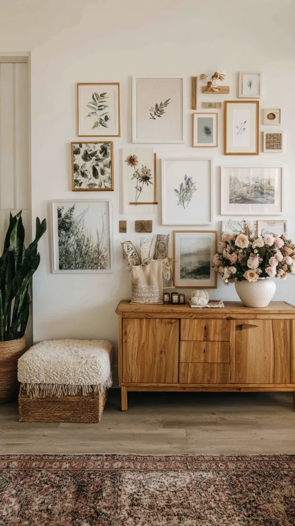 Botanical prints from independent artists cost $5–$25 each unframed. Vintage frames from charity shops run $2–$10 each and add more character than new frames from a homewares chain. Small woven wall textiles cost $15–$40 each and can be hung without a frame using a dowel or a nail. Dried pampas grass in a small vase or dried botanicals mounted on card add organic texture to the arrangement. A wall of fifteen to twenty mixed elements assembled over several months costs $80–$200 in total and becomes increasingly personal and characterful as each new piece finds its place.