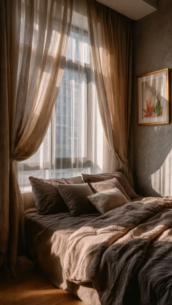 Allowing natural light to flow freely into the bedroom enhances every earthy element in the space. Sunlight highlights textures, warms neutral tones, and creates gentle shadows that add visual interest. Sheer curtains or light linen drapes filter the light softly, maintaining privacy while preserving brightness. A naturally lit bedroom feels more alive, calm, and connected to the rhythms of the day.