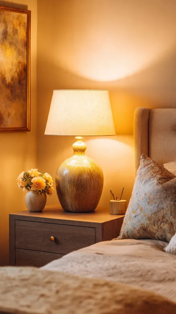Soft, warm lighting enhances the earthy palette by adding depth and comfort. Table lamps with fabric or ceramic bases, wall sconces with warm bulbs, and subtle overhead lighting work together to create a layered glow. This lighting style avoids harsh brightness and instead wraps the room in warmth, making evenings feel restful and intimate.