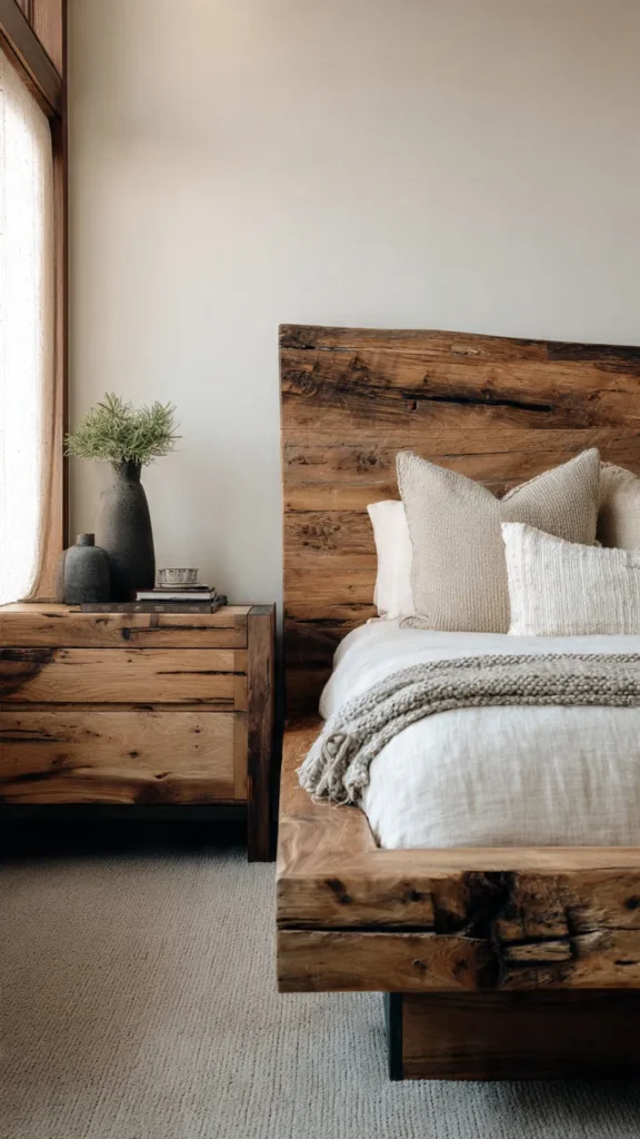 Natural wood furniture forms the backbone of an earthy bedroom. Bed frames, nightstands, and dressers made from oak, walnut, or reclaimed wood add authenticity and warmth that cannot be replicated by synthetic materials.