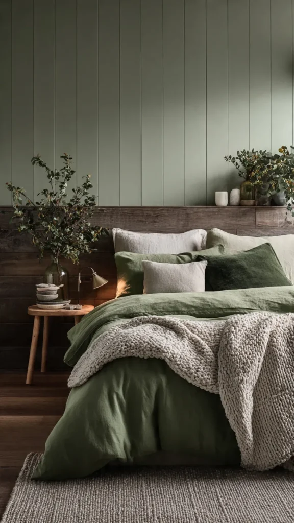 Muted greens inspired by moss, olive leaves, and eucalyptus bring a refreshing yet calming presence to the bedroom. These tones remind us of forests and gardens, creating a subconscious connection to growth and renewal. Earthy green walls or textiles make the room feel alive without being stimulating. Combined with wood and natural fabrics, green becomes a bridge between the indoors and outdoors.