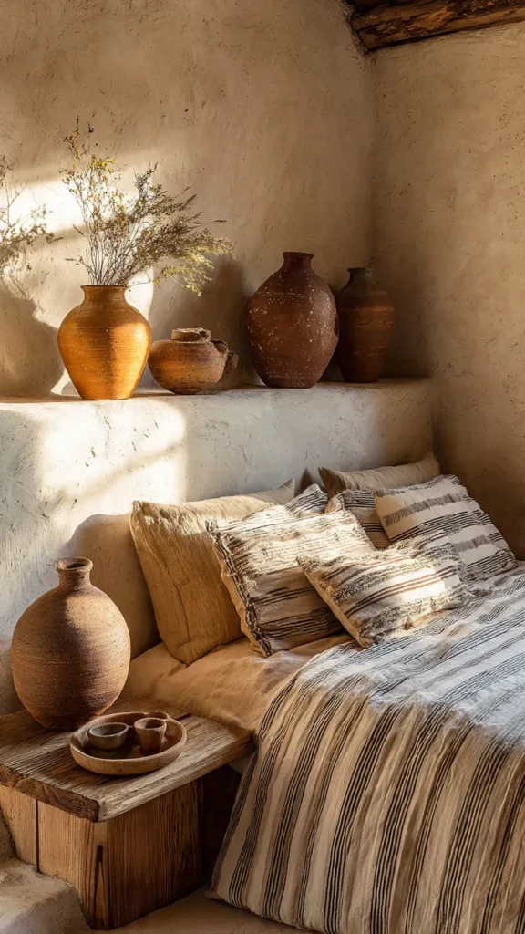 Ceramic vases, bowls, lamps, or trays add an artisanal, human touch to an earthy bedroom. The irregular shapes, matte finishes, and subtle color variations make each piece feel unique and personal. These handcrafted elements introduce warmth and authenticity, making the space feel curated rather than styled. They bring a sense of soul into the room, connecting it to craft, tradition, and human creativity.