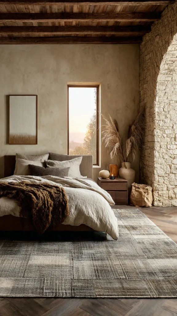 Rugs in shades of beige, brown, rust, or muted patterns anchor the room and provide a sense of warmth underfoot. Natural fiber rugs such as jute or wool add texture and softness while reinforcing the earthy theme. They visually ground the furniture and create defined zones within the bedroom, making the space feel structured yet relaxed.