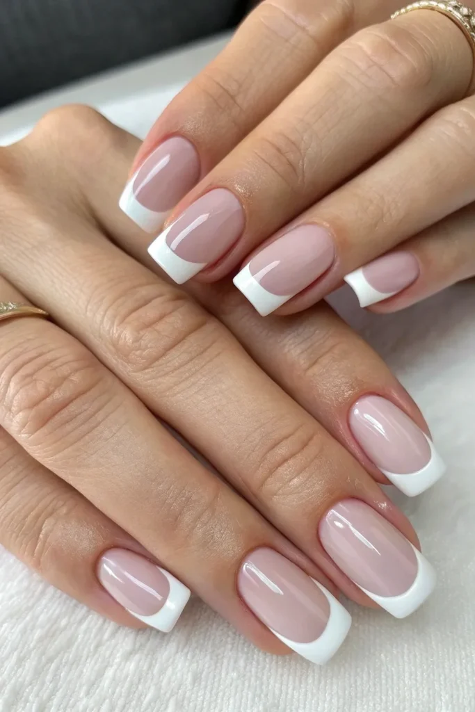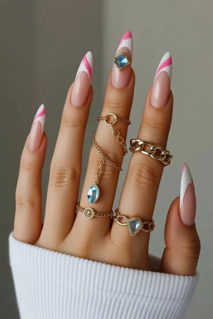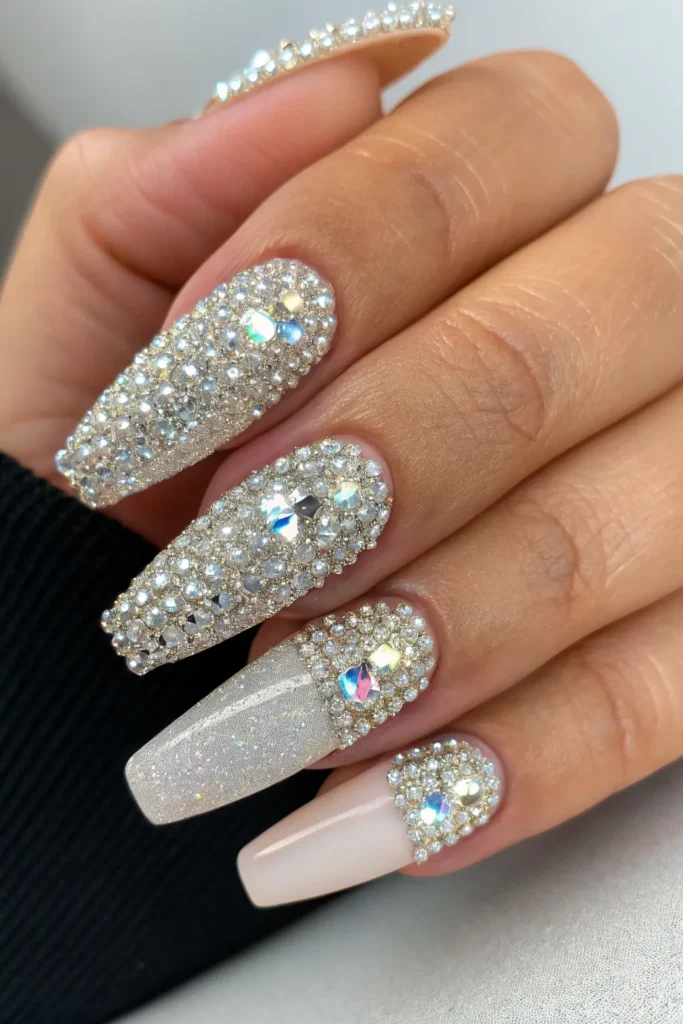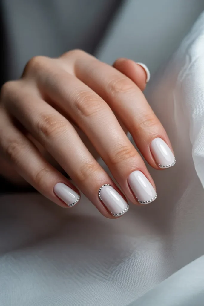 A crisp white base with rhinestone outlines along the edges looks clean but powerful. It gives a bridal glam touch while staying versatile.