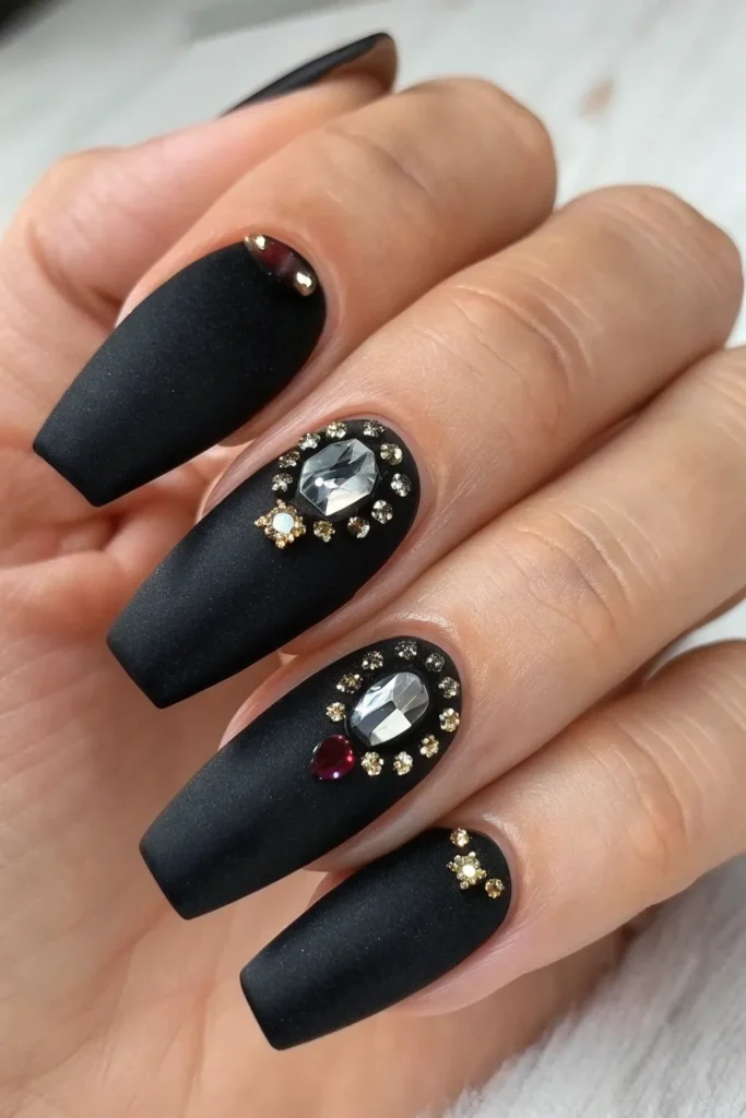 A velvety matte black finish paired with glossy details or gems feels rich and mysterious. It’s sleek and statement-making without being too loud.