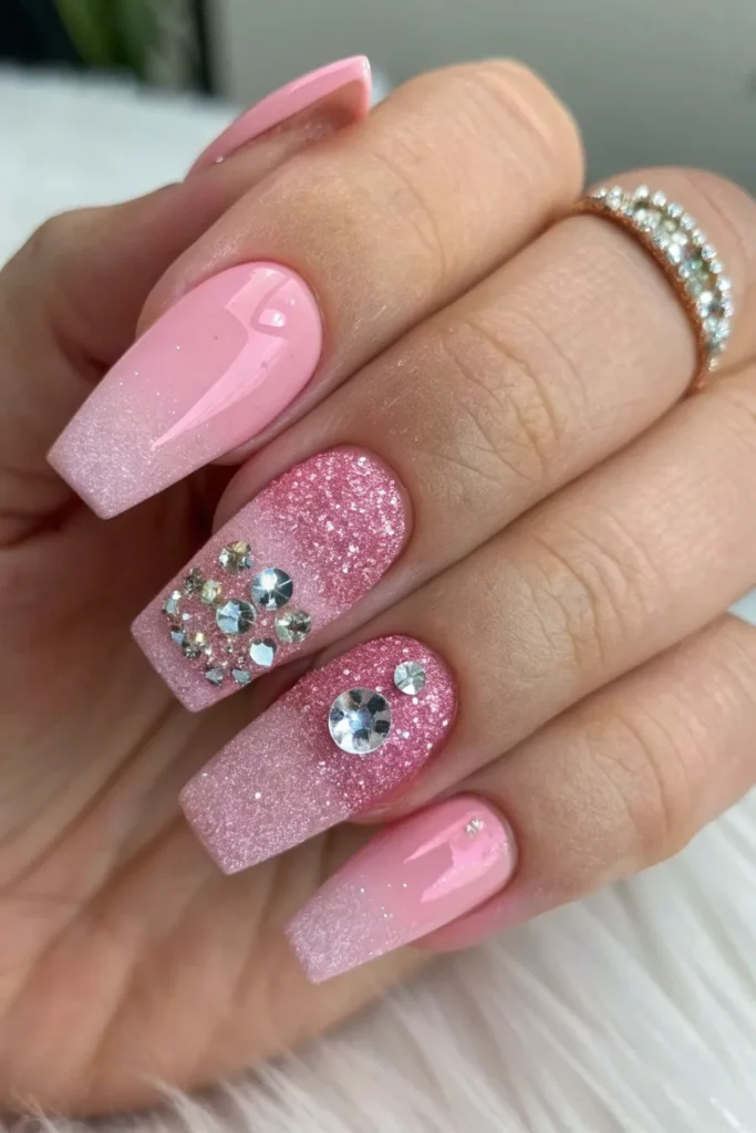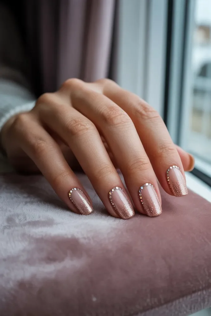 Create an ombre blend from nude to pink or gold and decorate the tips with cascading rhinestones. The gradient gives the perfect balance of shine and elegance.