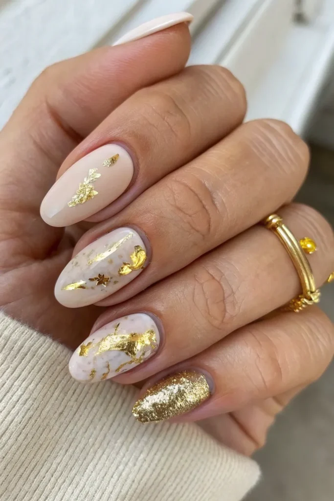 A soft nude base decorated with gold foil gives a perfect mix of class and confidence. It’s understated luxury with a bold twist.