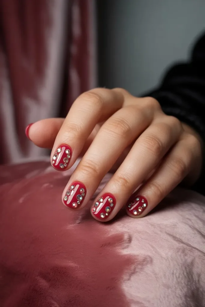 Fiery red polish paired with scattered rhinestones creates an unforgettable look. It screams power, passion, and classic glamour.