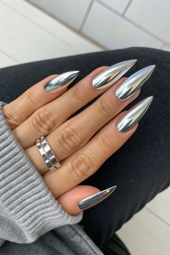 Long stiletto nails coated in silver chrome polish exude futuristic luxury. This metallic shine is sharp, edgy, and impossible to ignore.