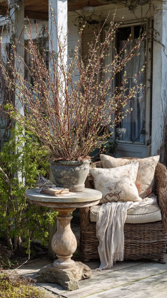 A simple side table or plant stand placed near your seating area gives you the perfect opportunity to create a little spring vignette. Arrange a small potted plant, a lantern with a candle, a decorative bird figurine, and a stack of books or a small bowl filled with river stones.