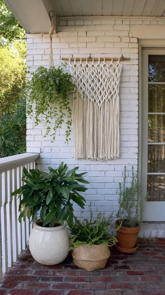 Textile wall hangings add warmth and bohemian charm to any porch. Macramé pieces in natural cotton or jute are inexpensive and widely available at craft stores, discount shops, and online marketplaces.