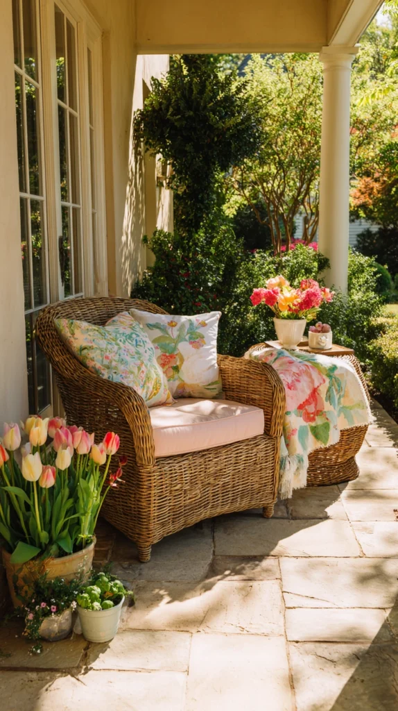 The goal is to create a clearly defined spot that invites you and your guests to sit, breathe, and enjoy the season. Add a cozy throw in a spring color, a small lantern for evening light, and a candle with a floral or herbal scent to complete the experience.