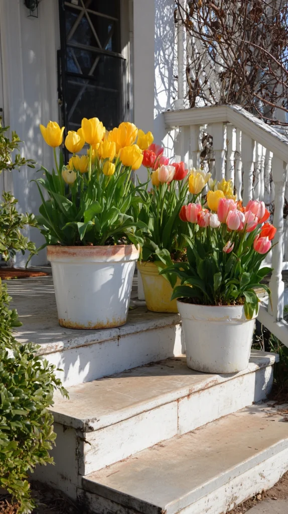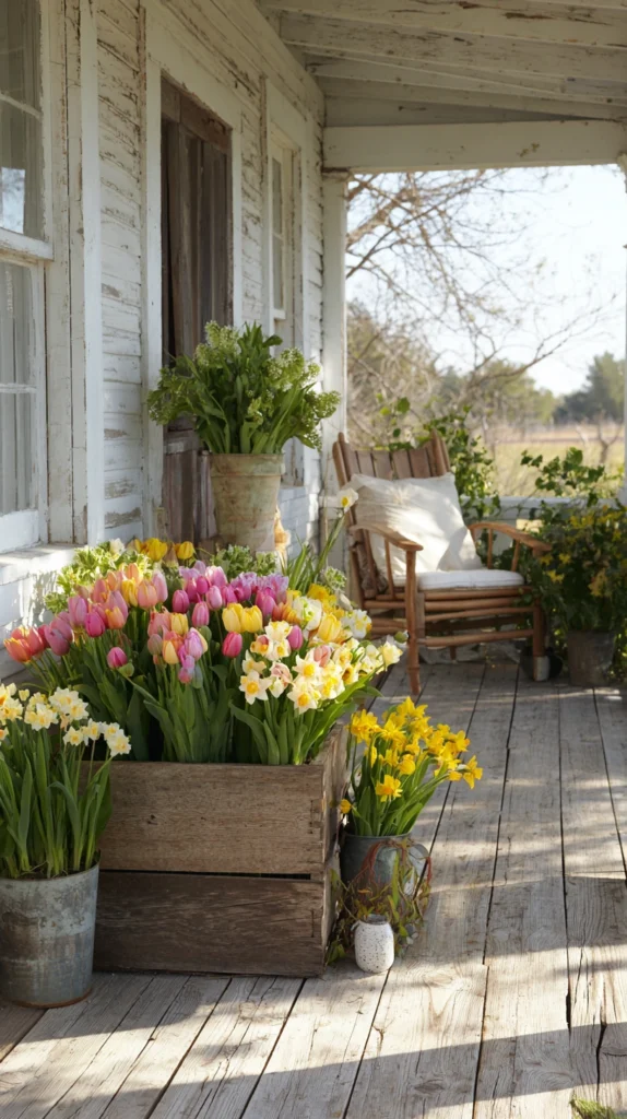 Spring bulbs like tulips, daffodils, hyacinths, and crocuses are inexpensive and widely available at garden centers and even grocery stores during the equinox season. Group them in clusters on your porch steps or along the railing in mismatched pots for a charming, cottage-garden look. You can find affordable terra cotta pots at thrift stores or discount retailers, and painting them in pastel shades adds a personal touch without spending much. Bulbs bring incredible color and fragrance that make your porch feel genuinely alive.