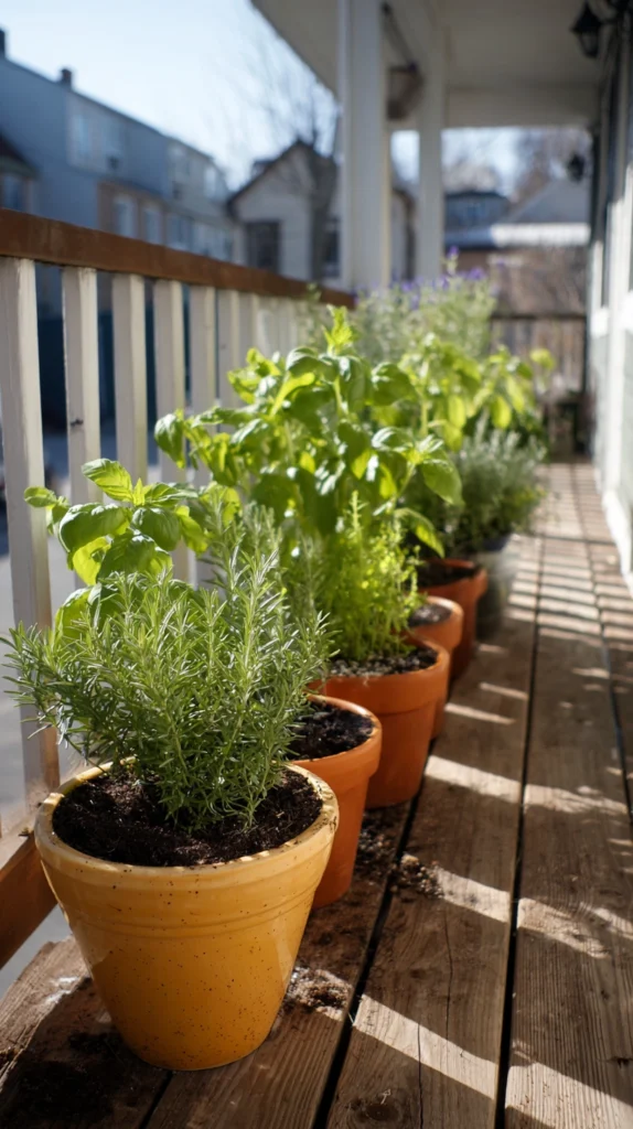 A small collection of potted herbs on your porch serves double duty as both decoration and a practical kitchen resource. Plant basil, mint, rosemary, thyme, and parsley in small pots and arrange them on a wooden tray or a tiered plant stand.