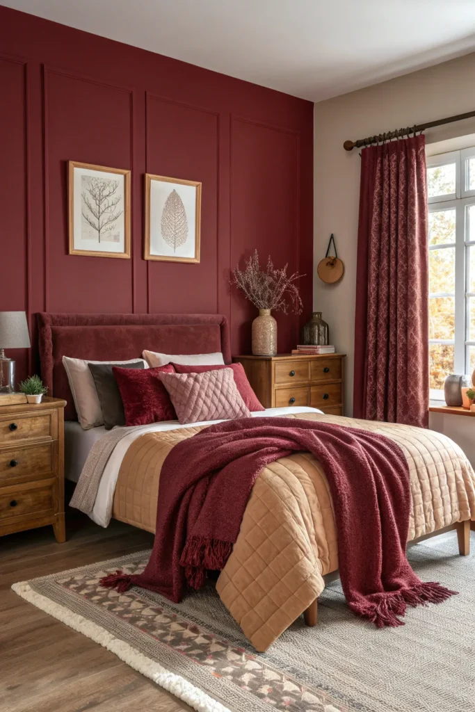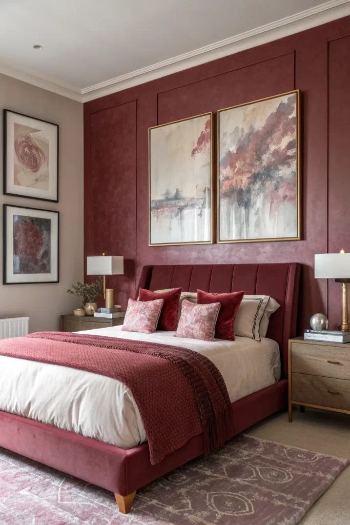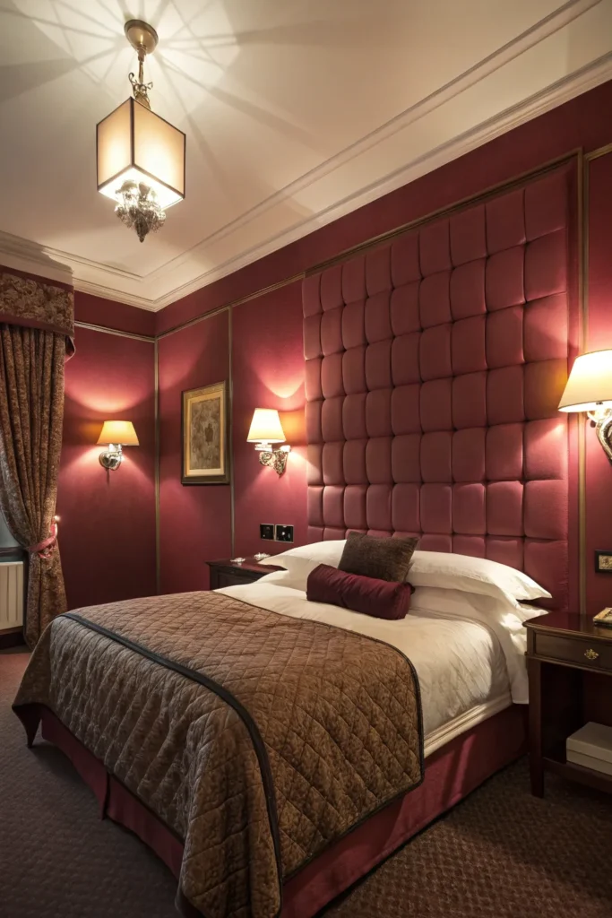 A burgundy accent wall instantly sets a bold and luxurious mood. It gives the room depth and makes the bed area feel grounded and intimate.