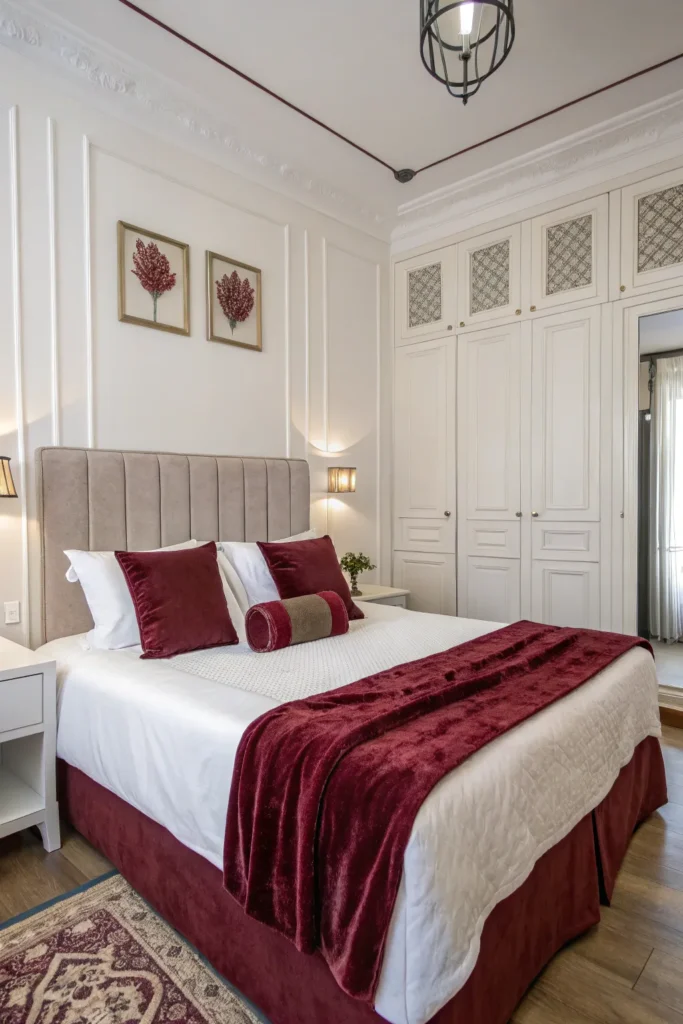 White walls or bedding paired with burgundy accents create a fresh and crisp contrast. This keeps the room from feeling heavy.