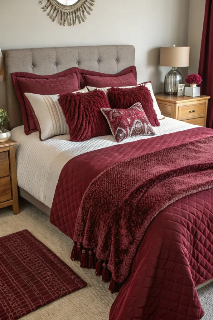 Texture adds richness without adding visual clutter. Use knit throws, embroidered pillows, or quilted bedding in burgundy tones.