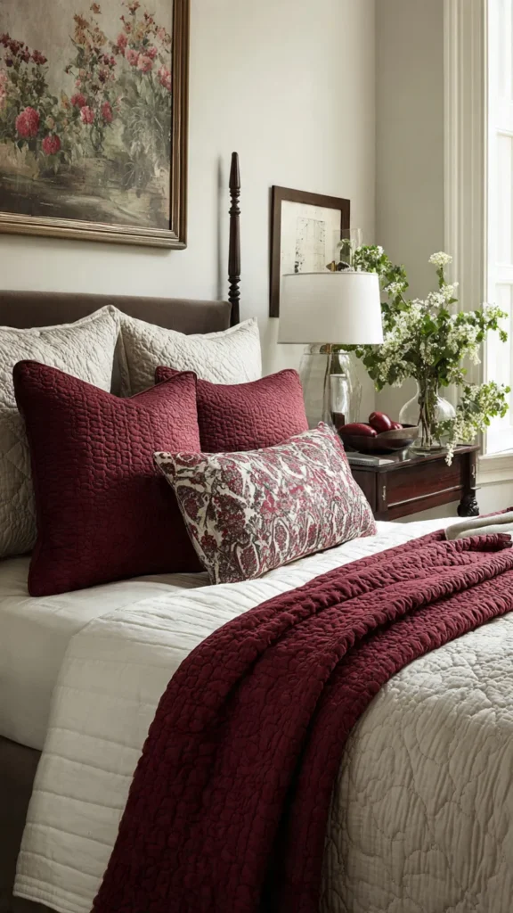 Layering burgundy pillows, throws, or quilts over neutral bedding adds color without overwhelming the space. This keeps the look controlled and refined.
