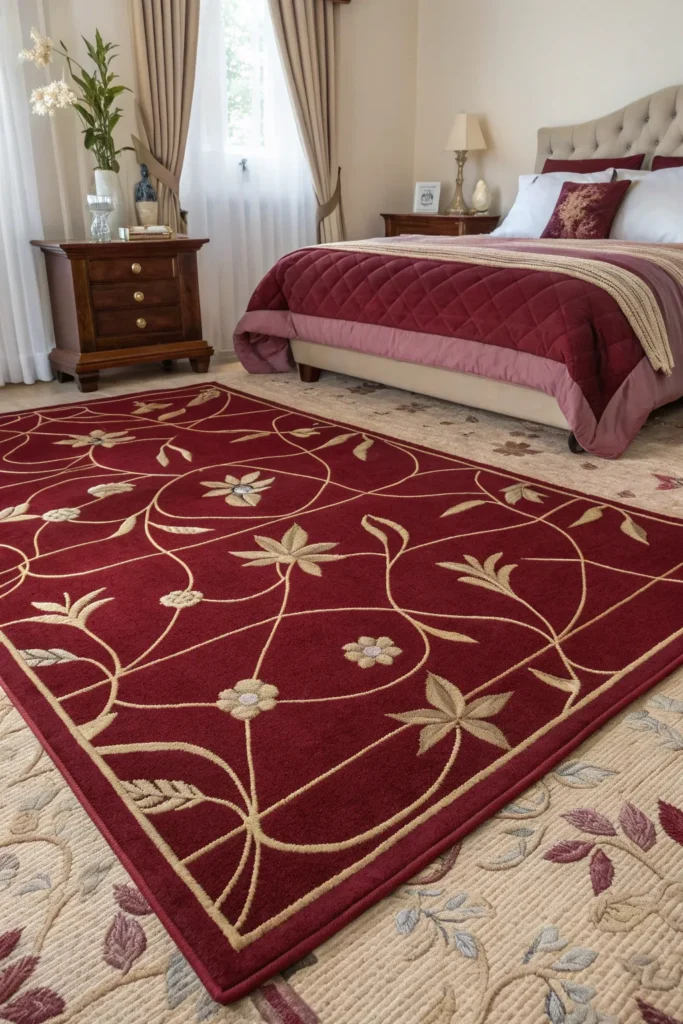 If a full burgundy wall feels too bold, use it as an accent through décor. Pillows, artwork, or rugs can introduce color gently.