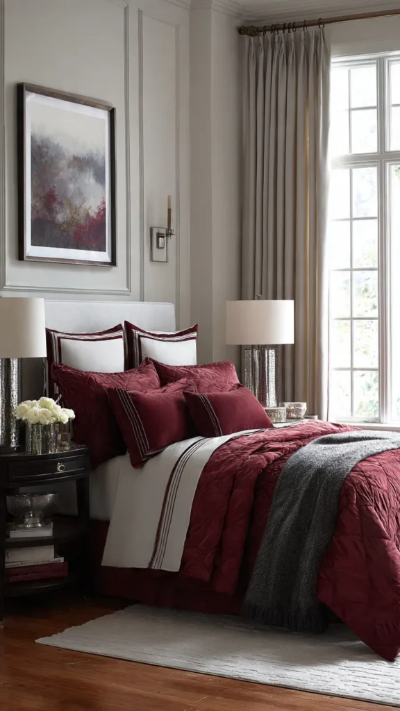Use light gray walls or bedding to contrast with burgundy accents. This keeps the room feeling airy and calm.