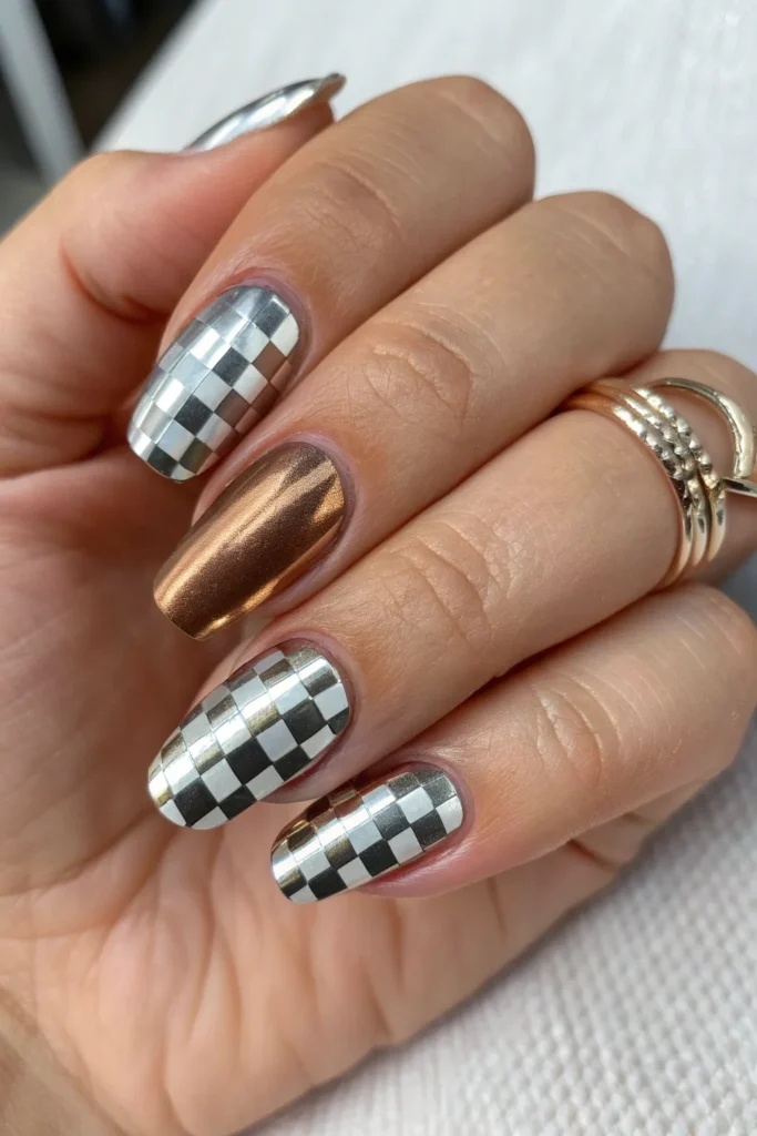 Add some edge with metallic silver or gold checks over a black or nude base. The reflective shine makes your nails look futuristic with a retro heart.