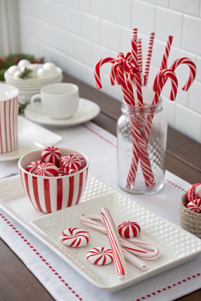 For a fun and family-friendly look, go all-in with red and white candy cane decor. Use striped ribbons, peppermint ornaments, and matching table settings. A hot chocolate corner with candy cane stirrers adds extra sweetness.