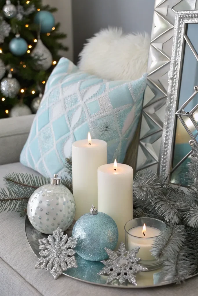 To make it cozy, mix in soft fabrics like faux fur throws or wool pillows. The silver tones reflect lights and candles perfectly, creating a stunning, luminous effect that feels sophisticated but still festive.