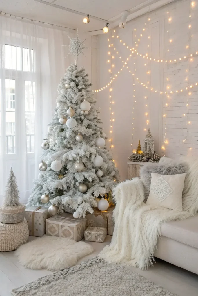 Turn your home into a snowy paradise with an all-white Christmas theme. White fairy lights, frosted ornaments, and silver accents give your space a clean and dreamy feel. A white tree or flocked branches can make a big statement even in a small room.