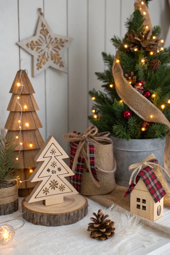 If you love cozy, countryside charm, go for rustic farmhouse decor. Think wooden ornaments, burlap ribbons, pinecones, and warm string lights. A few plaid pillows or a checkered table runner can instantly bring that rustic holiday spirit to life.