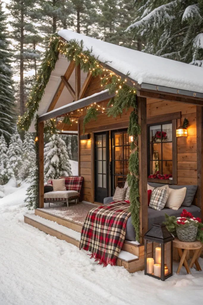 Layer soft textiles like flannel and wool throughout your living room and bedroom. A few rustic lanterns or a faux fireplace setup completes the cozy cabin aesthetic, making every corner feel like a winter retreat.