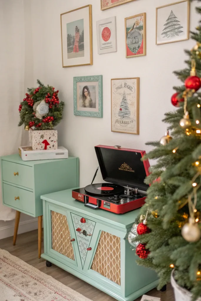 Add a record player with classic Christmas tunes, or hang framed vintage holiday cards for a personal touch. Mixing old and new pieces makes your home feel full of history and warmth—perfect for a heartfelt holiday vibe.