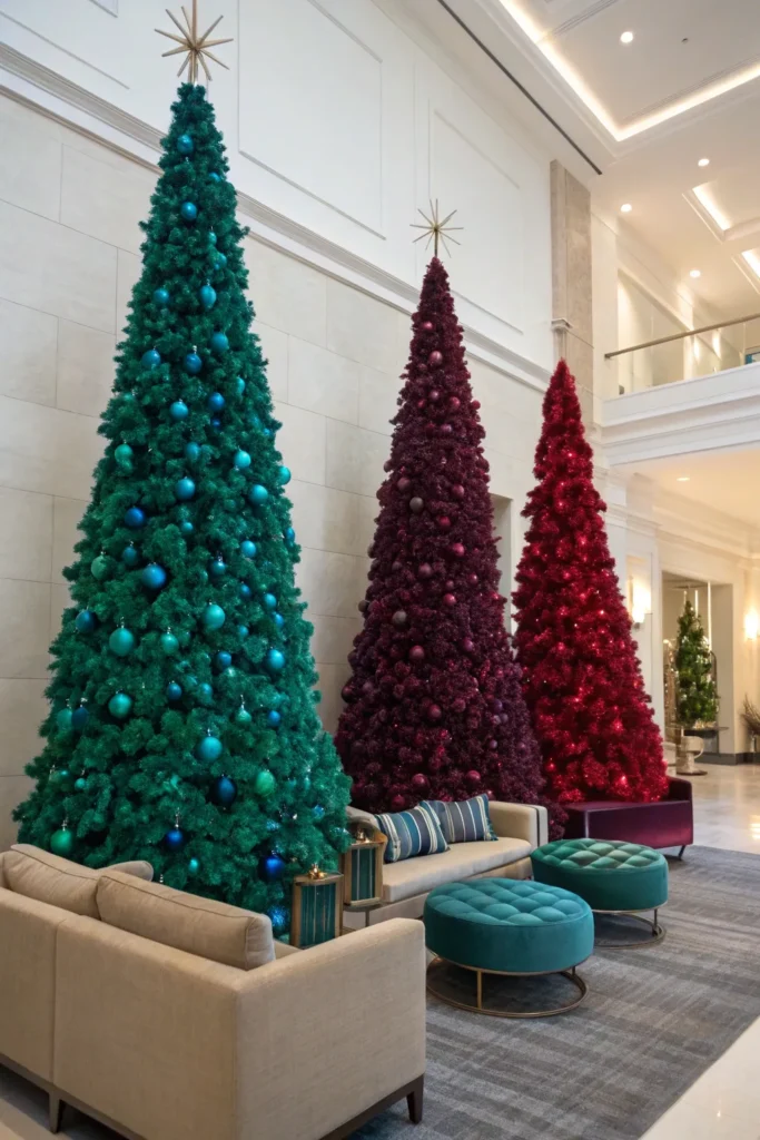 For a modern and dramatic twist, try jewel tones like emerald green, royal blue, and deep burgundy. These rich colors add luxury and depth to your Christmas setup. Pair them with metallic accents like gold or bronze for an opulent effect.