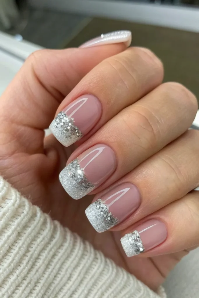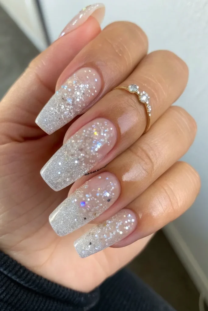 This elegant style keeps your nails clean and polished while adding a touch of silver at the tips. The gradient glitter effect gives a refined shine that works beautifully for both everyday wear and special events. You can pair this with silver jewelry for a cohesive and chic finish.