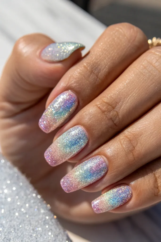 Holographic flakes transition smoothly from the tips to the center of each nail, creating a mesmerizing rainbow shimmer under light.
