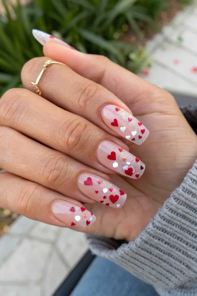 Delicate heart-shaped glitter embedded in clear nails gives off a cute, romantic vibe. It’s ideal for Valentine’s Day or any time you want to embrace a soft, loving aesthetic.