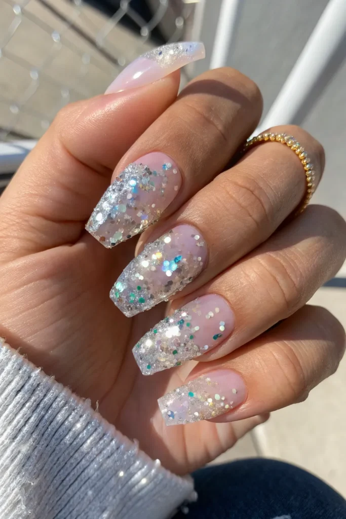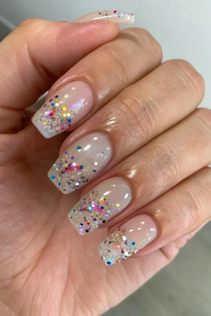 7. Clear Nails with Confetti Glitter Layers